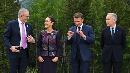 México no pertenece al G-7, pero ha sido invitado por el anfitrión, el canadiense Mark Carney, un gesto que han agradecido en Presidencia y que aventuraba una extraordinaria ocasión para reunirse con Trump en territorio neutral y abordar, quizá, algunos asuntos a tres bandas con Carney. Los tres son socios del tratado de comercio de América del Norte, un acuerdo que entrelazaba fuertemente sus economías y que ahora pasa momentos inciertos por las embestidas arancelarias de Trump. Ese tratado está por revisarse en algunos extremos o bien por renegociarse por completo. Nada de eso ha sido posible tras la marcha del republicano, pero Sheinbaum sí ha charlado con Carney en privado. Después, la mexicana ha valorado la relación entre ambas naciones “no solo en comercio, sino también en cultura y en amistad” y le ha regalado al primer ministro un balón de fútbol hecho por indígenas de la comunidad wixárika. El Mundial del año que viene tiene sus sedes repartidas entre México, Canadá y Estados Unidos. En contrapartida, Carney destacó el liderazgo de Sheinbaum y la “importancia de que México esté en el centro de la cooperación internacional”. Después se permitió parafrasearla: “No hay progreso a menos que sea compartido”, dijo y apreció ese “espíritu de México que Canadá comparte”.