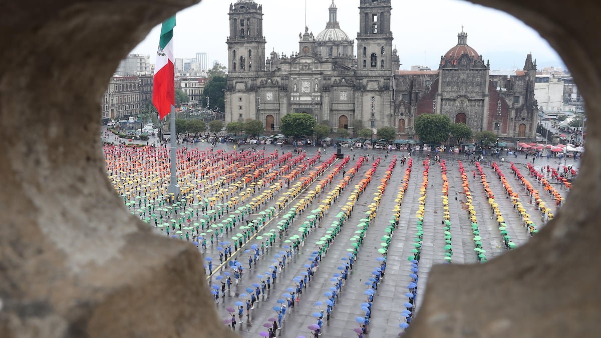 Con el objetivo de crear la bandera humana LGBTQ+ más grande del mundo, cientos de personas ataviadas con camisetas de colores y paraguas practicaron una coreografía siguiendo las indicaciones del personal del gobierno de Ciudad de México.