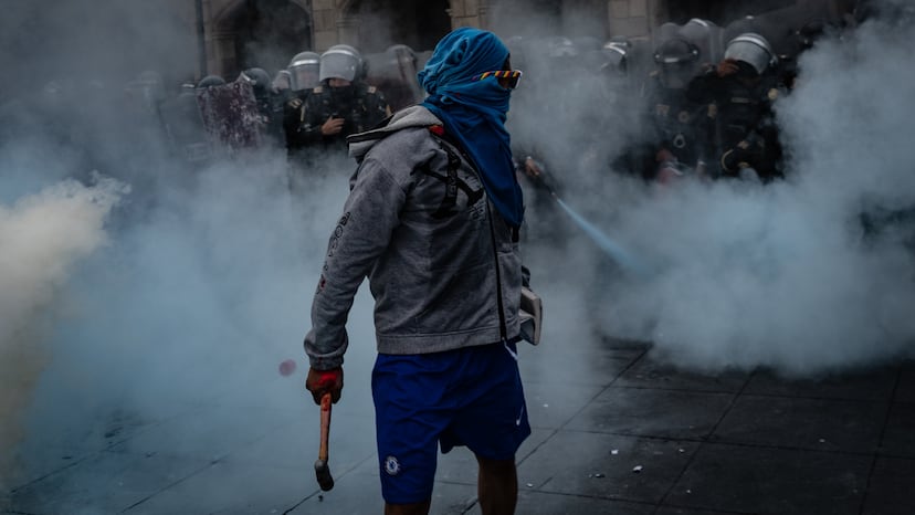 La manifestación ha marchado desde la Plaza de las Tres Culturas hasta Palacio Nacional. En el camino, locales de tiendas de alimentación han sufrido saqueos, los manifestantes han encendido hogueras aisladas en Eje Central y las calles paralizadas al tráfico han quedado marcadas con pintadas con las consignas de la marcha. Al llegar un Zócalo que los esperaba con la bandera a media hasta por los estudiantes asesinados, un grupo de encapuchados se ha enfrentado con la policía que resguardaba el lugar. Entre vítores, han lanzado objetos, petardos y hasta bombas molotov. Los agentes han contenido los incendios con extintores y han lanzado gas lacrimógeno que ha inundado la plaza. La tensión ha escalado y ambos grupos han pasado a los golpes, mientras algunos manifestantes han conseguido quitar escudos y cascos a los antidisturbios. La organización Brigada Humanitaria de Paz Marabunta ha tenido que intervenir para frenar los enfrentamientos y atender a algunos manifestantes, que han terminado ensangrentados y heridos.