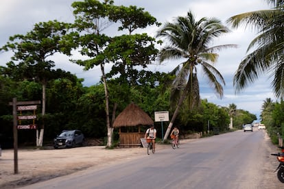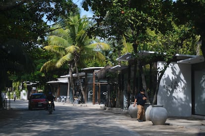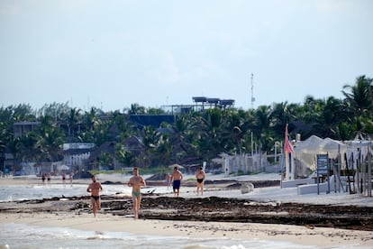 Durante la pandemia de la covid, Tulum floreció: los nómadas digitales llegaron hasta esta localidad de 46.000 habitantes y la llenaron de vida mientras la enfermedad arreciaba en el mundo. La cantante Dua Lipa se dejó ver en las playas de la zona hotelera y las fotos en redes sociales de vacaciones en el sitio crecieron con efervescencia. David Borjas se mudó entonces de Ciudad de México a Quintana Roo, halló un trabajo en la hotelería de la Riviera Maya y se volvió un visitante regular de Tulum. Desde la orilla del mar, que se ha teñido de rojo por los lixiviados del sargazo, observa a su madre y a su hijo que se están dando un chapuzón en una de las pocas playas con acceso a todo el público. “Esta playa es una de las pocas a las que se puede entrar sin pasar por un restaurante o un hotel, está agradable y tranquilo”, cuenta.