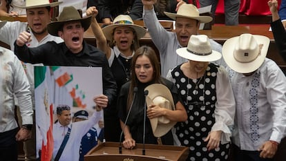 Un minuto de aplausos ha antecedido el arribo de Quiroz al salón de sesiones, seguido de un puñado de consignas que se mantuvieron durante los 50 minutos que duró la asamblea. “¡No estás sola, no estás sola!”, se ha escuchado una y otra vez. Unos días atrás, en el funeral de su esposo y padre de sus dos pequeños hijos, la mujer sacudió a la sociedad. “No mataron al presidente de Uruapan, mataron al mejor presidente de México. El único que se atrevió a decir siempre la verdad, sin temor por su familia ni por dejar huérfanos a sus hijos”, dijo horas después de que Manzo fuera asesinado a tiros en plena plaza pública durante las festividades del Día de Muertos. La votación ha sido unánime en una sesión salpicada con reclamos al Gobierno de Sheinbaum por desatender los llamados de auxilio del séptimo presidente municipal asesinado en el último año. “Presidenta, Claudia Sheinbaum, no puede decir que no sabía, usted no lo recibió. Su silencio tiene nombre y apellido, tiene rostro, tiene hijos y tiene viuda”, lanzó Carlos Bautista Tafolla, diputado independiente e integrante del Movimiento del Sombrero, nombre con el que bautizó Manzo a su proyecto político.