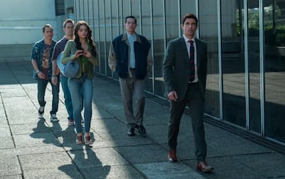 Santos hizo un ejercicio similar cuando estuvo a cargo de la adaptación de la serie Belascoarán, basada en los libros de Paco Ignacio Taibo II sobre su famoso detective capitalino, para la recreación del cine noir, un estilo distintivo del género policial. “Las películas del cine noir tienen vapor en las calles que sale de las cloacas, el clarooscuro y siempre están situadas en Chicago o Nueva York. Aquí no tenemos eso [Ciudad de México], pero el vapor sale de las ollas de tamales, de las de carnitas, entonces encontramos ese lugar donde conviven. En Me late que sí intentamos algo parecido con otro género. El ejercicio es similar, pero el resultado y los ingredientes son distintos. Era como ‘intentemos generar la sensación de que ahí vienen Brad Pitt y George Clooney, pero no, aparecen unos funcionarios del Melate’. Jugamos con el tratamiento visual y el lenguaje, pero con una bola de personajes mediocres que se enfrentan en una idea genial”, finaliza.