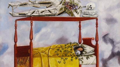 El sueño (la cama) se considera una de las representaciones más claras de la estética surrealista en la obra de Kahlo, aunque la misma artista explicó en su momento que no se identificaba con el movimiento: “No pinto sueños ni pesadillas, pinto mi propia realidad”. El cuadro fue realizado en 1940, en uno de los momentos más complejos para Kahlo, cuando atravesaba su divorcio (y los constantes intentos de reconciliación) con Diego Rivera, además de enfrentar problemas médicos y una profunda depresión. El autorretrato muestra a la artista recostada en su cama —el lugar que se volvió a la vez un lugar de descanso y una prisión— cubierta por un edredón amarillo y enredaderas. En la parte superior aparece un esqueleto en la misma posición, pero rodeado de dinamita y sosteniendo un ramo de flores. “La estructura de la cama se convierte tanto en un soporte físico como en un andamiaje metafísico, un escenario en el que la muerte flota —literalmente— sobre la vida. El sueño (La cama) ofrece, sin duda, una meditación espectral sobre la frontera entre el sueño y la muerte”, detalló Sotheby’s.