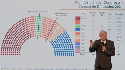Mano tendida al PRI. Los nuevos equilibrios de poder configurados por los comicios del domingo han convertido a los 69 diputados priistas en el nuevo objeto de deseo de Andrés Manuel López Obrador. A Morena no le basta con sus socios para alcanzar la mayoría calificada, tres cuartas partes de los 500 escaños de la Cámara, necesaria para abrir la puerta de las reformas constitucionales, el caballo de batalla del presidente de cara a la segunda parte de su mandato.