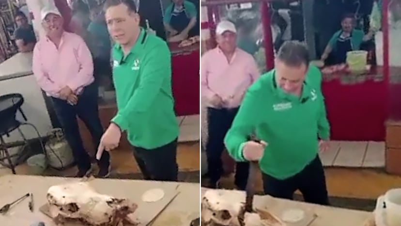 Eugenio Hernández Flores, candidato por el PVEM al Senado, aparece en un acto de campaña con un machete golpeando la cabeza del animal aludiendo a Francisco Cabeza de Vaca