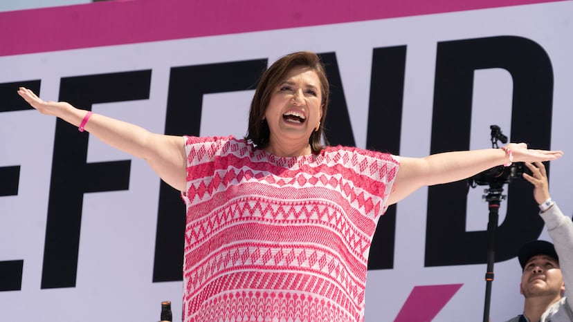 “Vamos adelante, vamos sin miedo, hombres y mujeres libres, vamos por la victoria”, afirmó Gálvez, en un templete colocado frente a la catedral. “Vamos a ganar para abrir la puerta de Palacio Nacional para todos los mexicanos”, dijo sobre la sede del Gobierno, que le quedaba del lado izquierdo y que se convirtió en una trinchera rodeada de altas vallas metálicas para evitar que se acercaran los manifestantes, como suele suceder en las marchas y protestas en la capital. Es la cuarta convocatoria de la Marea Rosa, que hasta hace unos días se definía como neutral y apartidista, y que hoy ha hecho pública su simpatía por la candidata del frente opositor. “Fuera máscaras”, dijo esta semana el presidente López Obrador, el blanco de todas las consignas. Desde la perspectiva del oficialismo y la oposición es momento de definiciones: hay dos modelos políticos, dos proyectos del país, dos candidatas que aspiran a ser la primera presidenta del país, Gálvez o Claudia Sheinbaum, de Morena.
