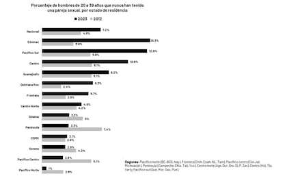 La falta de pareja sexual para los hombres jóvenes no se distribuye de manera homogénea por el país; afecta más al Edomex y los estados del Pacífico Sur. En el Edomex y Quintana Roo, el porcentaje de hombres jóvenes sin pareja se ha triplicado en la última década. En la zona Centro, Frontera y Pacífico Sur se ha duplicado.