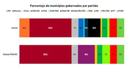 Los datos no son muy favorecedores para la alianza PAN-MC. Actualmente, el PAN gobierna en 434 municipios y MC en 197. Con una alianza, mis cálculos indican que ambos gobernarían apenas 330, una reducción significativa. Esto se debe a que varios de los municipios que actualmente son gobernados por la alianza PRI-PAN quedarían en manos de Morena o del PRI al romperse esa alianza.