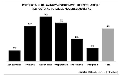Esto también se refleja en su nivel educativo: las tradwives son más comunes entre mujeres con educación secundaria (13%). En cambio, entre quienes tienen posgrado o no cuentan con educación primaria las tradwives casi no existen (4% o menos). En el primer caso, porque prevalece el deseo de trabajar. En el segundo, porque la necesidad económica obliga a hacerlo.