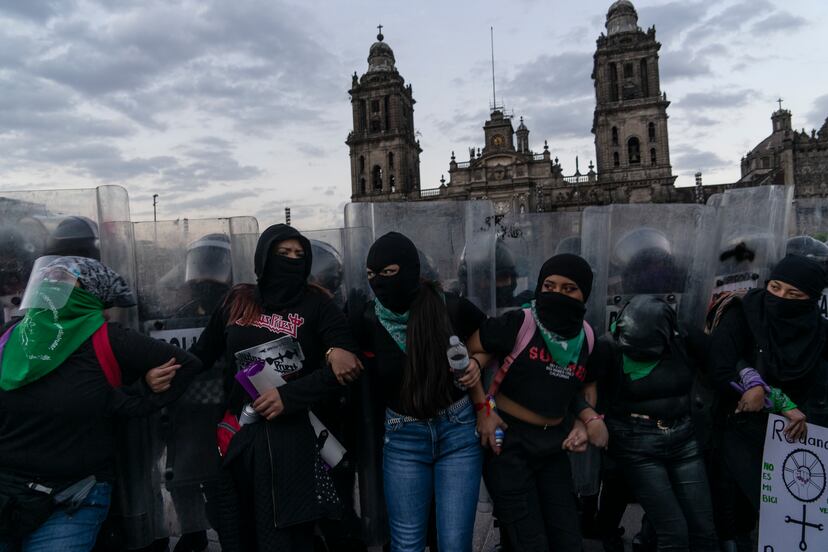 Al llegar al Zócalo, ubicación de la catedral, el Ayuntamiento, el Palacio de Gobierno federal y también estos días de un campamento instalado por la ultraderecha que busca sacar del poder a López Obrador, estas jóvenes arremetieron contra todo. Llegaron a romper la doble valla, reforzada con metacrilato instalado por la policía, y se dieron de bruces contra la emblemática puerta del Palacio ante una hilera de agentes desarmados y atónitos. Pintaron sus puertas con espray fucsia, lanzaron botellas de agua y apalearon todo lo que pudieron. Hasta que la formación policial las acabó acorralando y huyeron hacia el otro extremo de la plaza.
