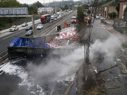 Un motorista resulta herido al resbalar sobre la hortaliza. La limpieza de la carretera SE-30, en la que se han formado retenciones de seis kilómetros, ha durado cinco horas