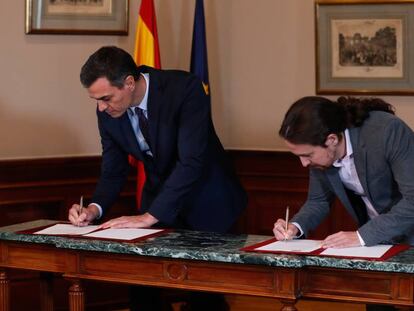 Los líderes de PSOE y Unidas Podemos firmaron este martes un acuerdo de Gobierno tras las elecciones