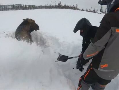 El rescate de un alce atrapado hasta el cuello en la nieve