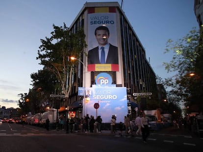 El PP cuelga una pancarta en la sede de Génova con el lema: "Hay partido". El líder pide a sus tropas que estén "contentos" y Sánchez a las suyas que no se confíen