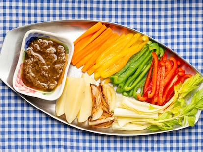 Una salsa sabrosísima elaborada a fuego lento con mucho ajo, anchoas y aceite de oliva donde se mojan verduras de temporada para morir del gusto