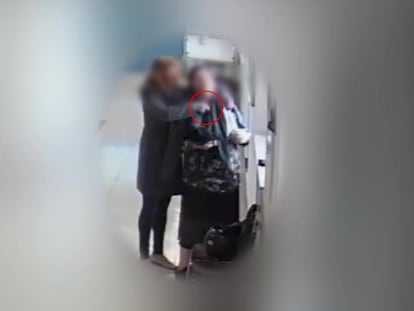 Una cámara de seguridad graba la secuencia de puñetazos y rodillazos a la mujer en un portal