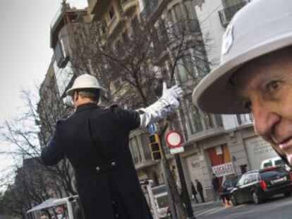 La asociación, con la ayuda de la Guardia Urbana de Barcelona, recupera una antigua tradición como reclamo Varios agentes dirigen el tráfico en la Rambla de Cataluña vestidos con el antiguo uniforme del cuerpo