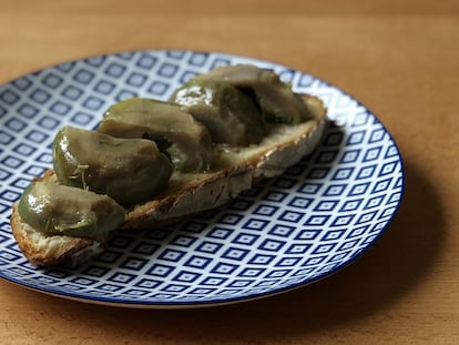 Confitamos unas alcachofas en aceite aromatizado con ajo, menta y limón -hirviéndolas un poco previamente para facilitar el trabajo- y las servimos sobre una tostada, al estilo de los 'antipasti' italianos.