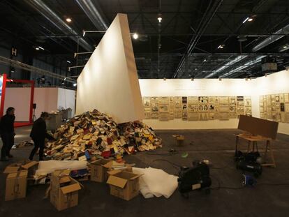 Alicia Martín y Fernando Bryce llevan al estand de EL PAÍS una revisión de la idea de cultura. Ella, dislocando las paredes con una de sus esculturas con libros. Él, con dibujos que cuestionan el relato oficial del pasado