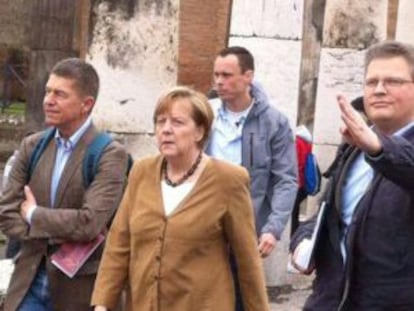 La canciller visita, con su marido Joachim, las famosas ruinas antes de instalarse en Ischia, su destino de descanso habitual