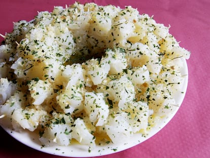 El clásico pincho no tiene más que bacalao crudo desalado, AOVE, ajo y perejil picados, todo ensartado en un mondadientes. Lo suyo es maridarlo con sidra fresca a presión
