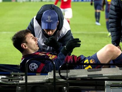 Messi abandona el duelo ante el Benfica en camilla ante el angustioso silencio de la hinchada El parte médico es tranquilizador: una contusión en la rodilla izquierda