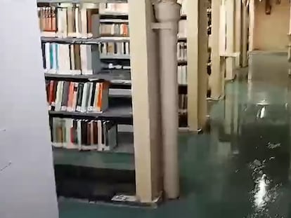 Un vídeo al que ha tenido acceso EL PAÍS muestra el suelo del piso 12º, en el depósito general del edificio, anegado y con agua cayendo por varias goteras. Se han visto afectados un centenar de libros de los años ochenta del pasado siglo