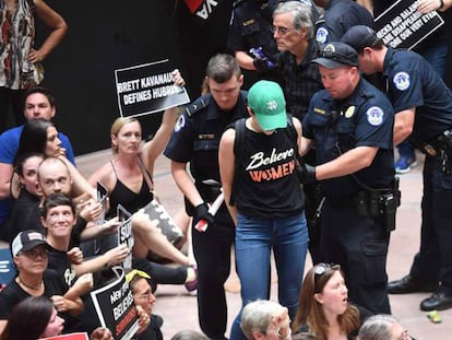 Los manifestantes, principalmente por mujeres, llegaron hasta el salón central de la Cámara alta estadounidense para protestar contra el candidato de Trump al Supremo