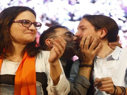 El líder de Podemos cierra con Colau y Oltra una campaña marcada por el debate territorial