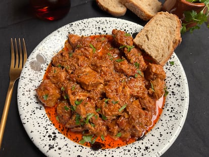 Carne guisada a fuego lento hasta que queda muy tierna, aromatizada con verduras, pimentón, vino blanco y el majado que da a la salsa una textura única