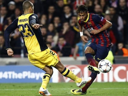 Barça y Atlético igualan de nuevo en un partido tenso e imposible para Messi ante un gran Godín Neymar, tras un gran pase de Iniesta, iguala el tanto de su compatriota Diego Ribas Se lesionan Diego Costa, con un pinchazo en el bíceps, y Piqué, con una contusión pélvica