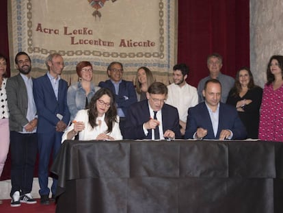 Los tres líderes políticos Ximo Puig, Mónica Oltra, y Rubén Martínez Dalmau desbloquearon el pacto minutos antes de iniciarse la sesión de investidura