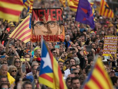Miles de personas han llegado desde primera hora a la población francesa, ataviados con banderas esteladas , barretinas y enseñas a favor de los políticos independentistas en prisión