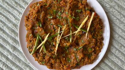 Una tapa o untable de berenjena asada típico de la cocina india, que contiene la mezcla perfecta de humo y chile