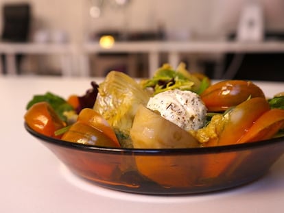 Ensalada de tomate, labneh y alcachofas.