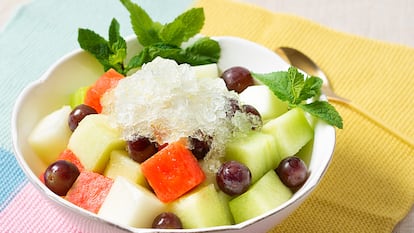 Fruta fresca de verano coronada con algo helado, nada puede ir mal en este postre que puede prepararse sin alcohol cambiando el cava por mosto