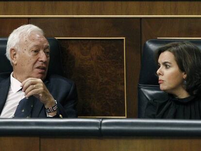 La vicepresidenta del Gobierno en funciones, Soraya Sáenz de Santamaría, y el ministro de Exteriores, José Manuel García-Margallo comparecen ante los medios tras la reunión del Gabinete, que ha dado luz verde a las subvenciones para paliar los daños del terremoto de Melilla