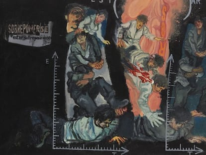 Las imágenes de los cuadros están abigarradas de personajes reales y ficticios y repletas de textos que reflexionan sobre cuestiones filosóficas