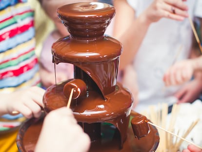 Modelos efecto cascada para sumergir frutas y dulces en chocolate con amigos y familiares