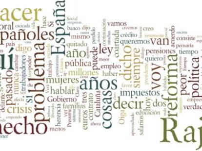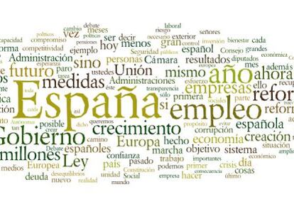 El presidente aludió constantemente al "futuro" porque la sociedad aún no percibe la mejoría Casi 60 veces repitió la palabra "España" y cinco veces se refirió a "Cataluña" Temas olvidados: ni una vez dijo "aborto" y solo hubo una mención a la "inmigración"