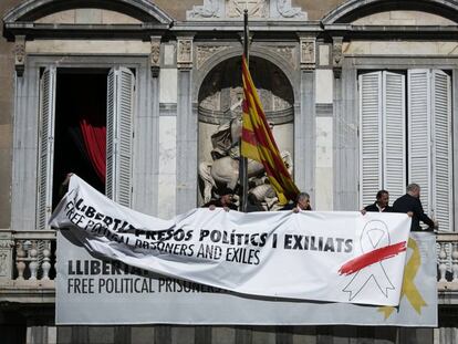 El cartell amb el llaç groc que lluïa al balcó del Palau de la Generalitat ha estat canviat per un altre amb el lema Libertat presos polítics i un llaç blanc amb franja vermella