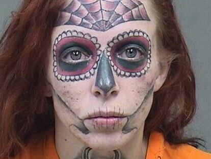 Su inconfundible rostro tiene una telaraña en la frente y adornos al estilo calavera del Día de los Muertos alrededor de los ojos, en los pómulos y en los labios