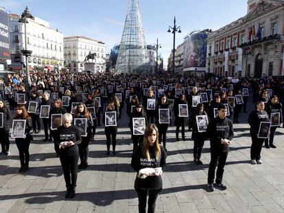 Activistas de Igualdad Animal denunciaron, este sábado desde la Puerta del Sol de Madrid, el "maltrato" que sufren los animales en granjas y mataderos
