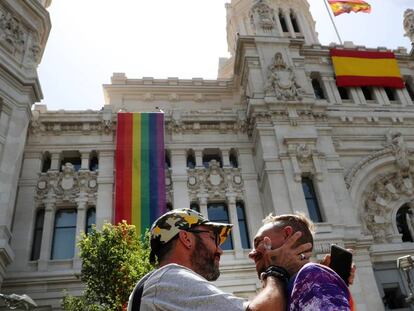 Almeida respeta la tradición que instauró Carmena con la enseña arcoiris, pero en un lateral de la fachada central, junto a una nueva rojigualda que Vox había pedido que instalasen