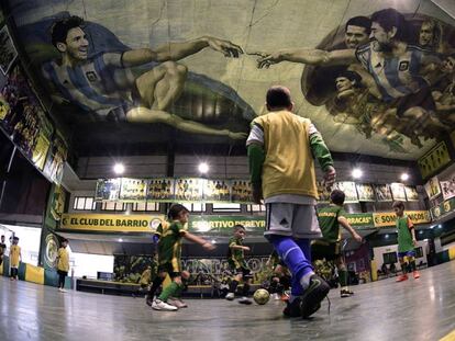 En el techo de un club deportivo juvenil de un barrio de Buenos Aires han recreado la célebre pintura de Miguel Ángel con los astros del fútbol argentino como protagonistas