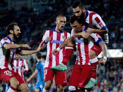 Los jugadores del Atlético celebran la combinación del primer gol y Simeone se queda con la victoria