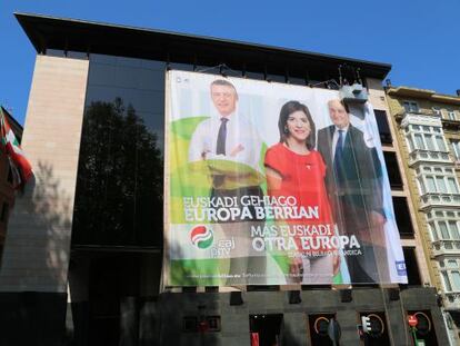 El PNV coloca un cartel en el que incluye a su candidata Izaskun Bilbao junto a Urkullu y Ortuzar