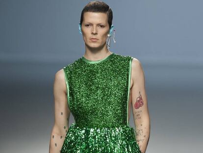 El diseñador presenta su colección ‘No one’, una apuesta por el binomio blanco-negro y los colores fuertes en la que destacan los accesorios: botas Dr. Martens y bolsos de Pelayo Díaz.