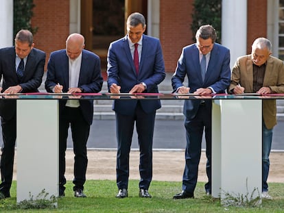 El presidente del Gobierno y los líderes de los sindicatos y la patronal formalizan en La Moncloa la firma de la cuarta fase de la reforma iniciada en 2021