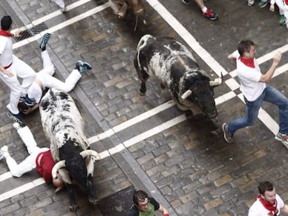 Los astados, de los que huyen las figuras por su fiereza, corren en Pamplona como corderitos